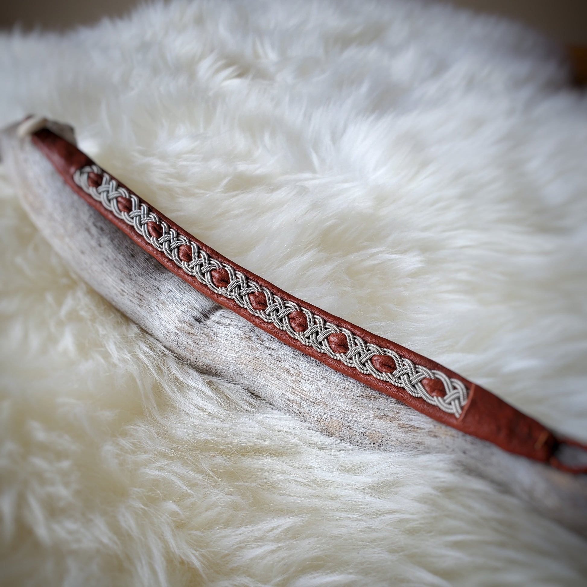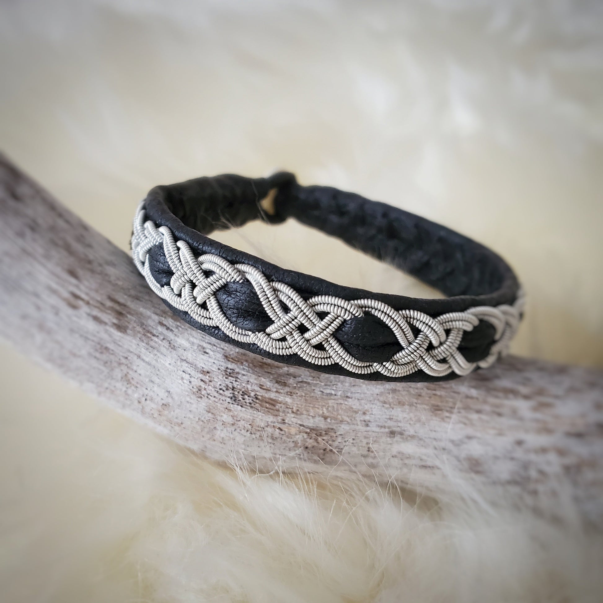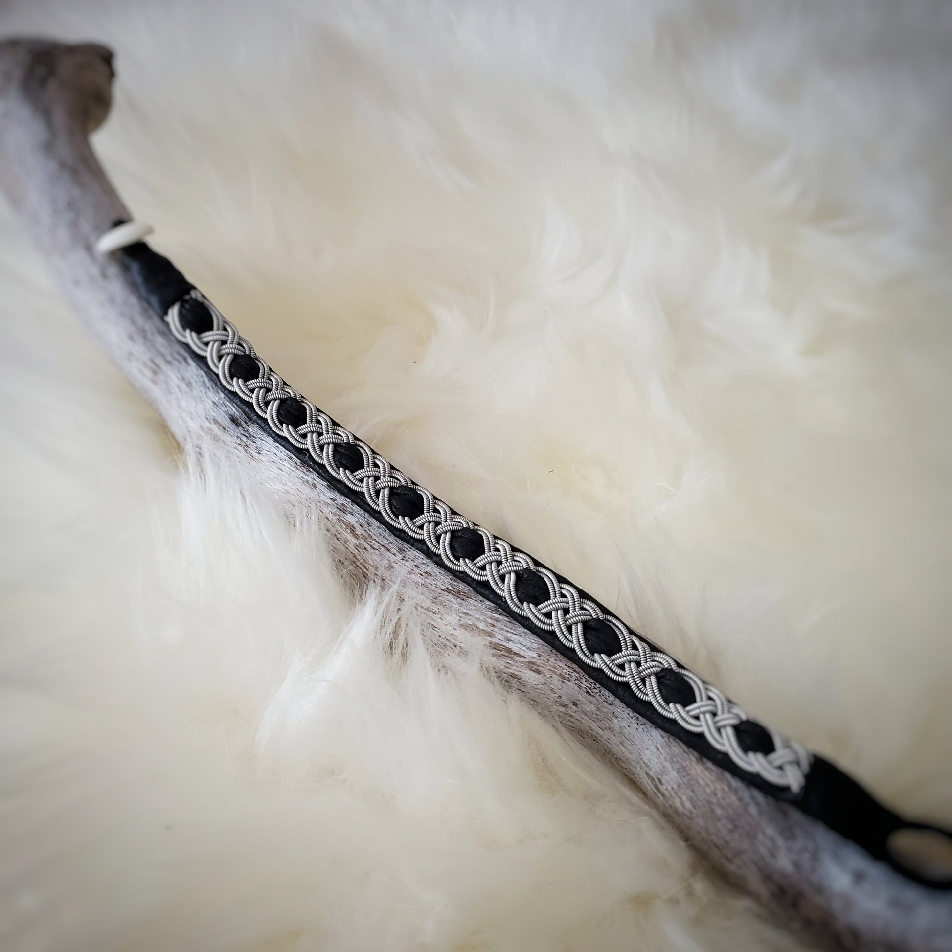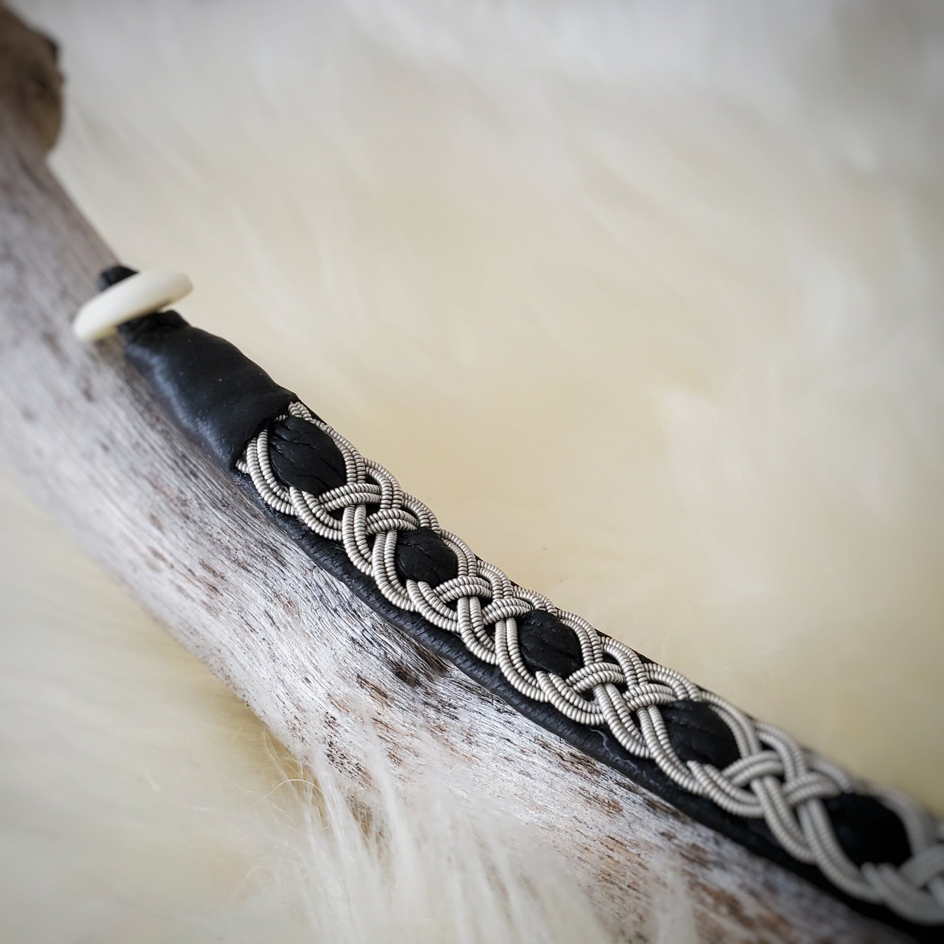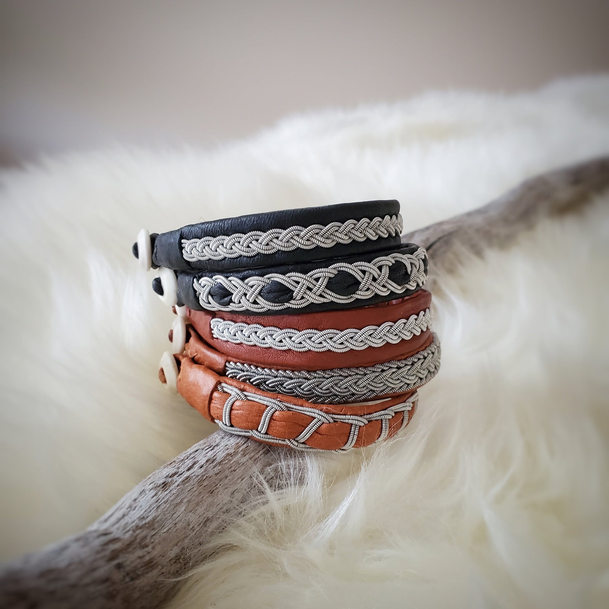 Introducing the beloved Sami bracelet, a reindeer leather band bedazzled with metallic (+silver) weaves and secured by a reindeer antler (shed) button.