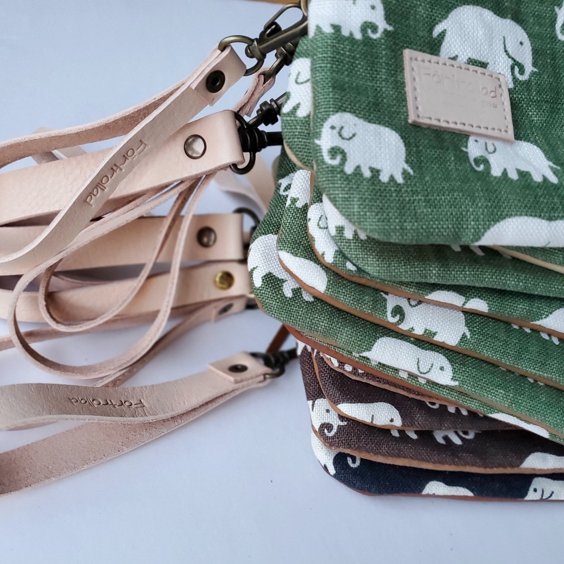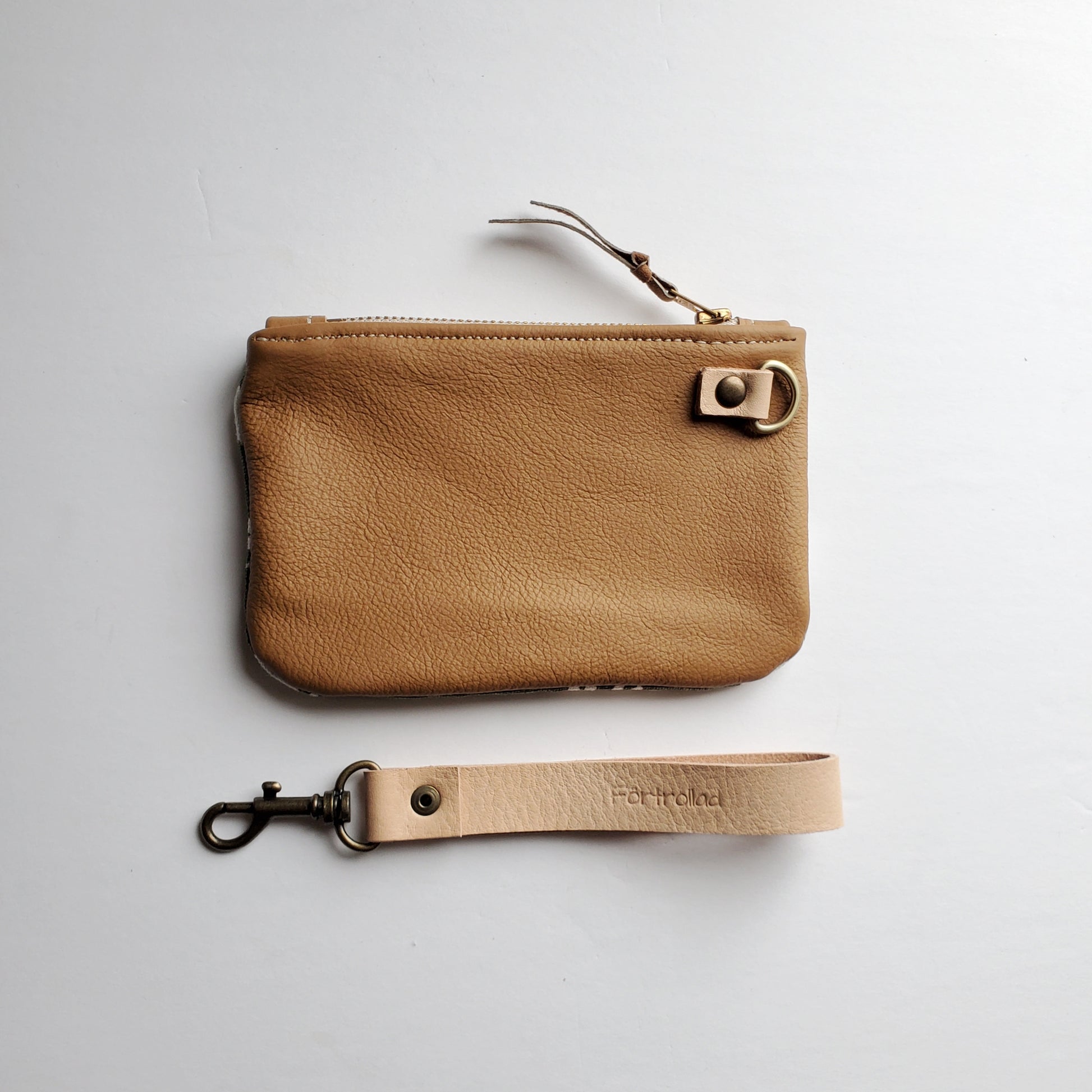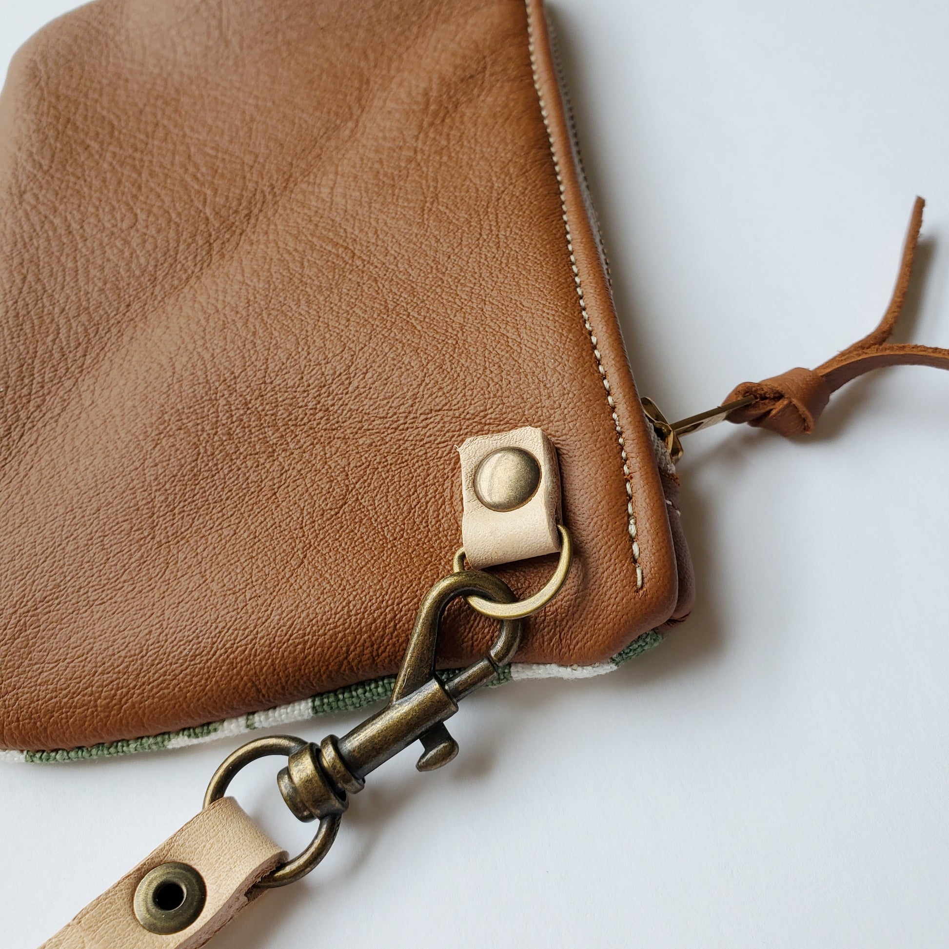 Made from surplus leather, repurposed denim (lining) and Swedish designer linen by Estrid Ericsson. The buttery wrist strap is 100% vegetable tanned leather.