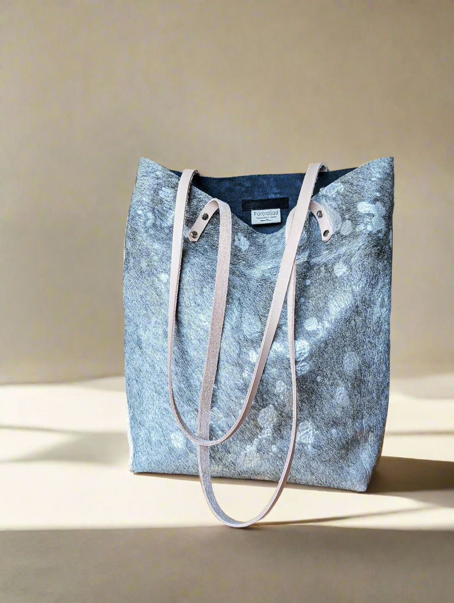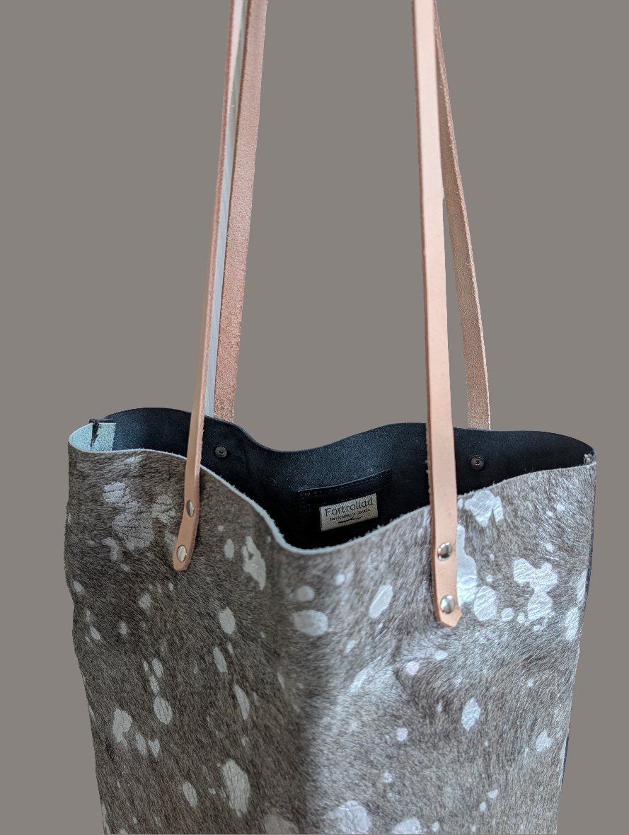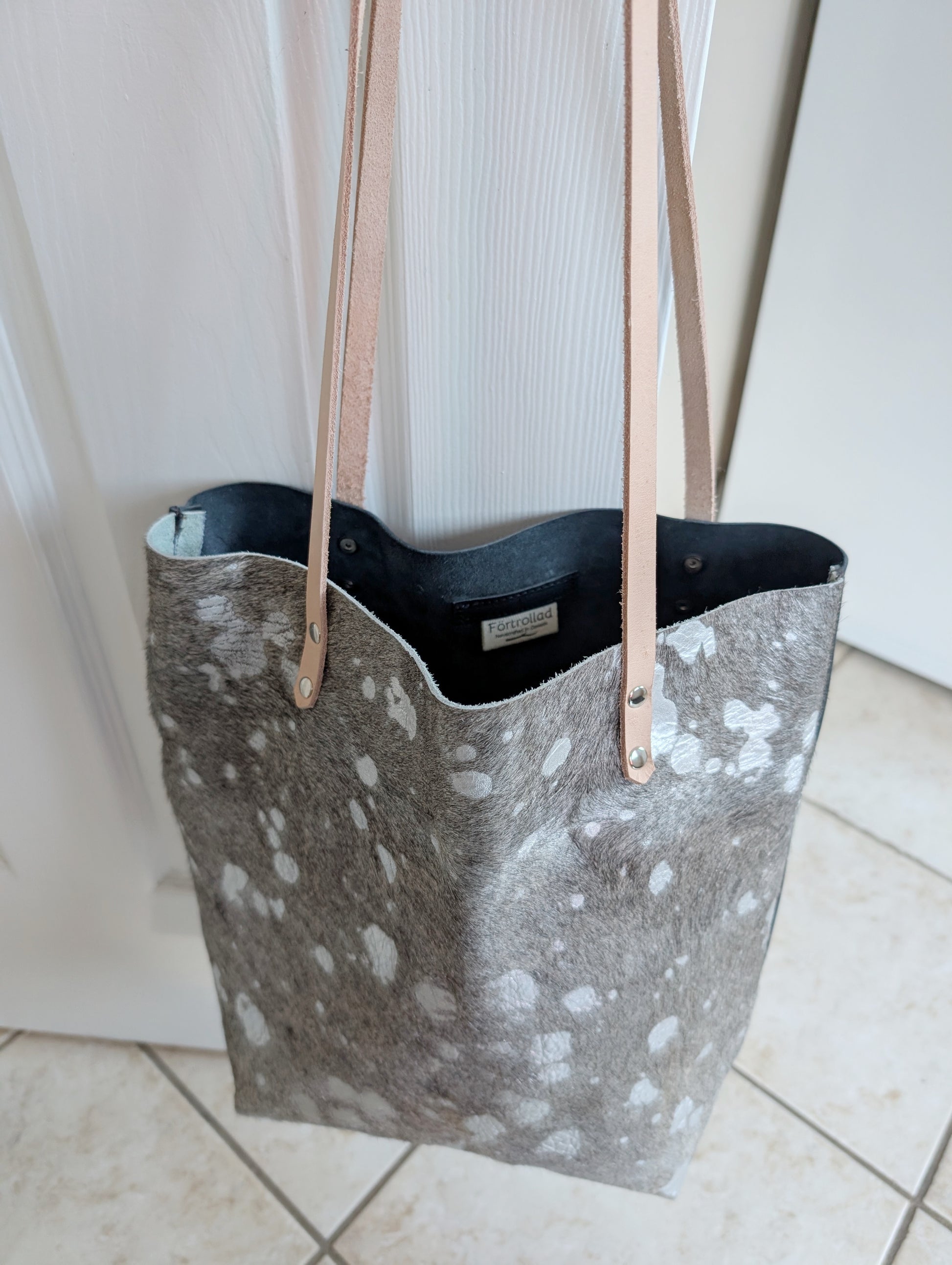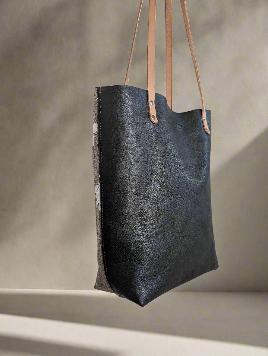 The Midgård Essential Tote is the perfect everyday accessory for any style. Made with hair on hide in one side and supple black leather on the other side, this understated tote offers an unlined and spacious interior. Its sturdy natural straps, with a 13" drop, make it comfortable to carry.