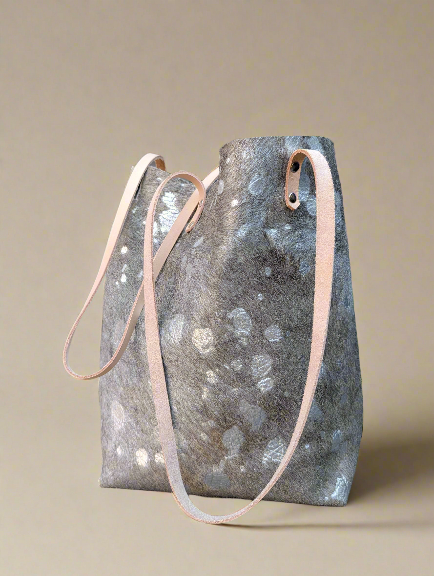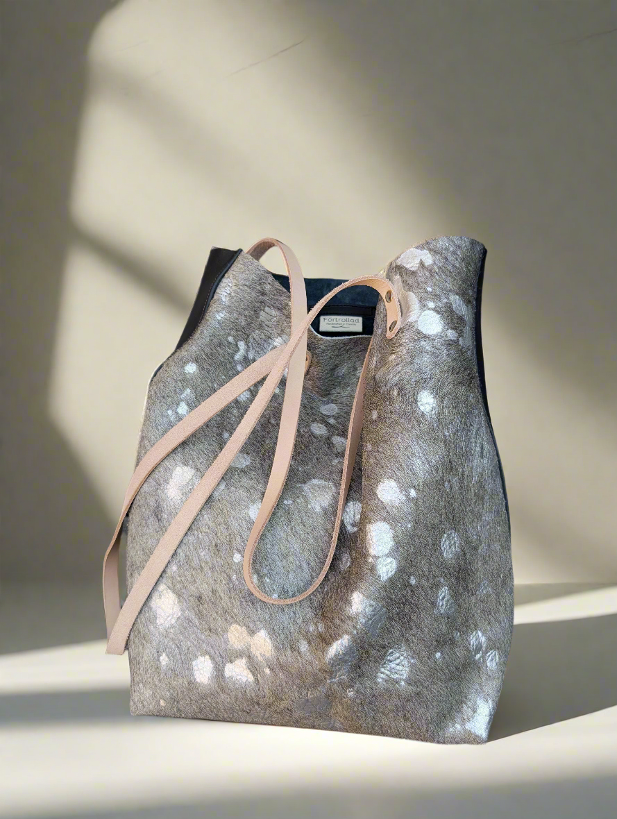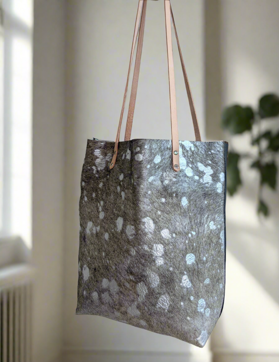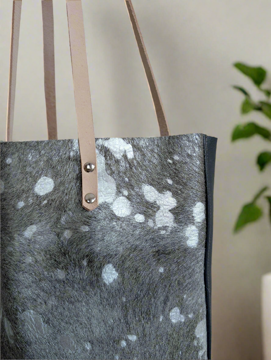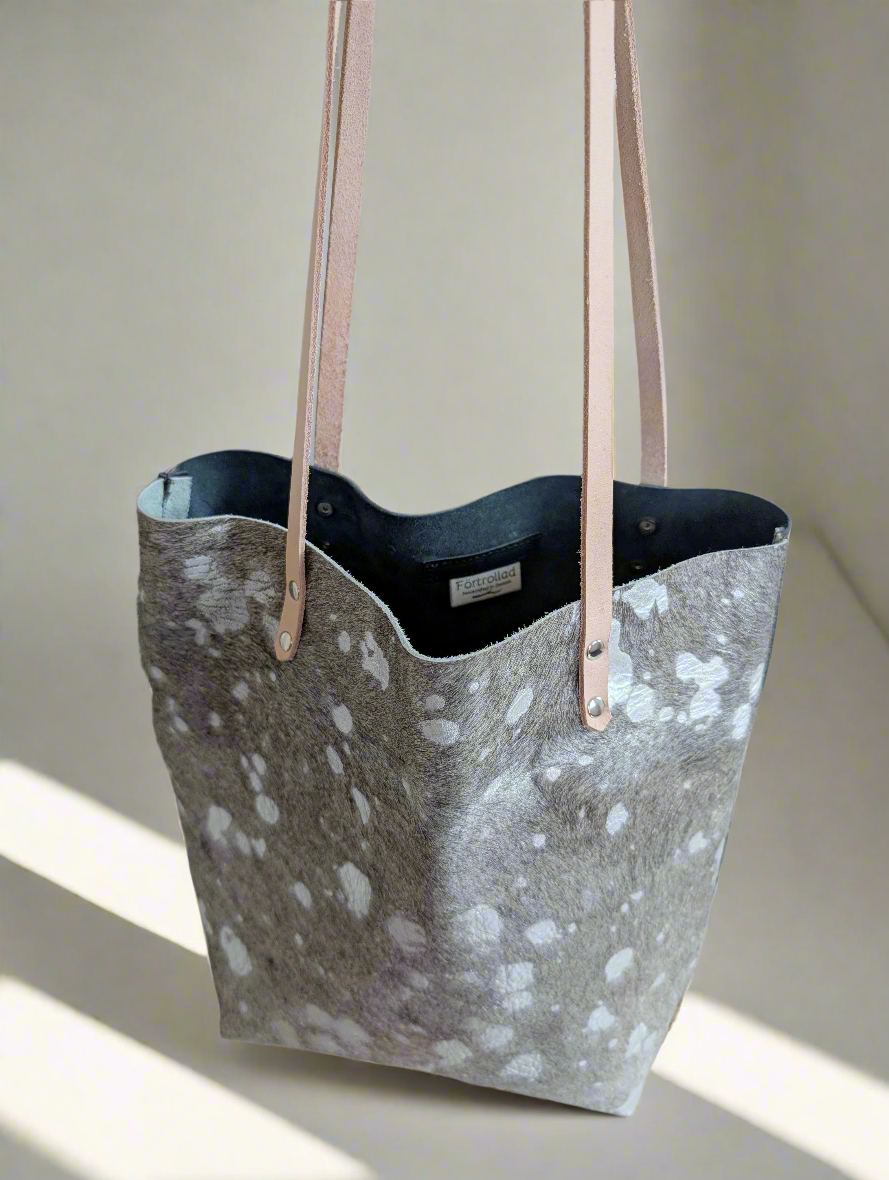 The Midgård Essential Tote is the perfect everyday accessory for any style. Made with hair on hide in one side and supple black leather on the other side, this understated tote offers an unlined and spacious interior. Its sturdy natural straps, with a 13" drop, make it comfortable to carry.