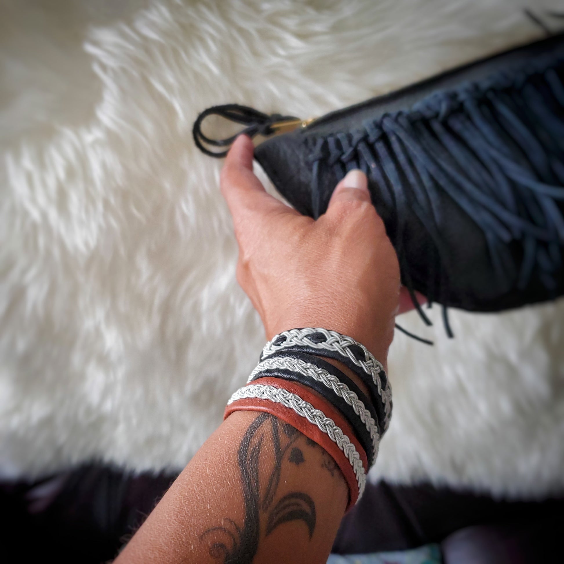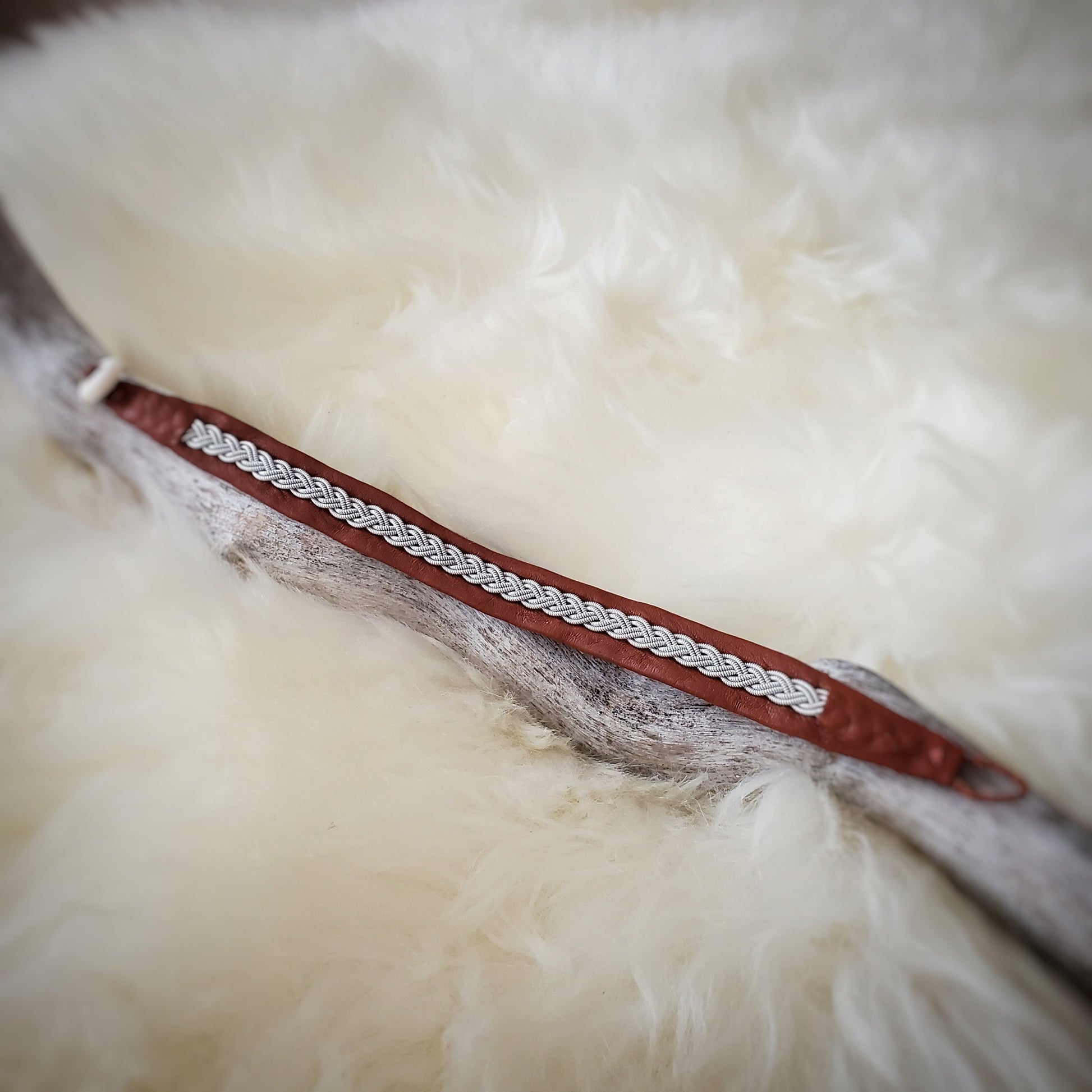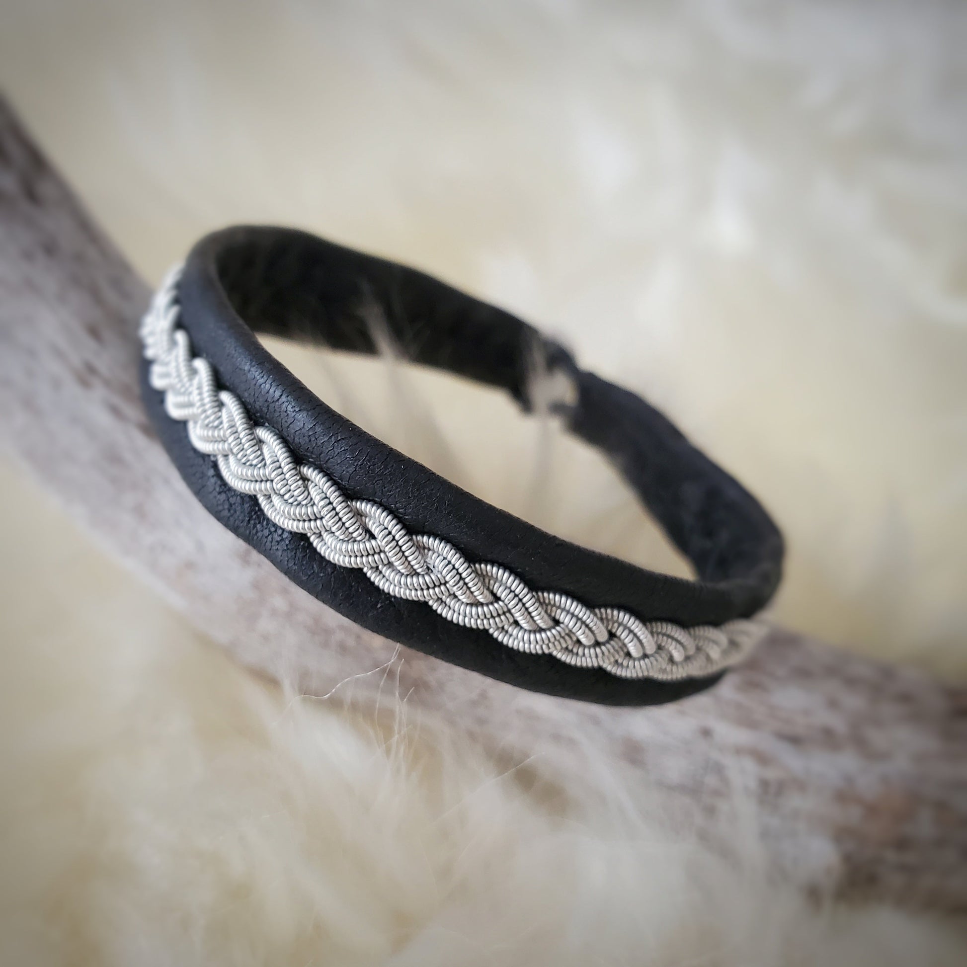 Introducing the beloved Sami bracelet, a reindeer leather band bedazzled with metallic (+silver) weaves and secured by a reindeer antler (shed) button.