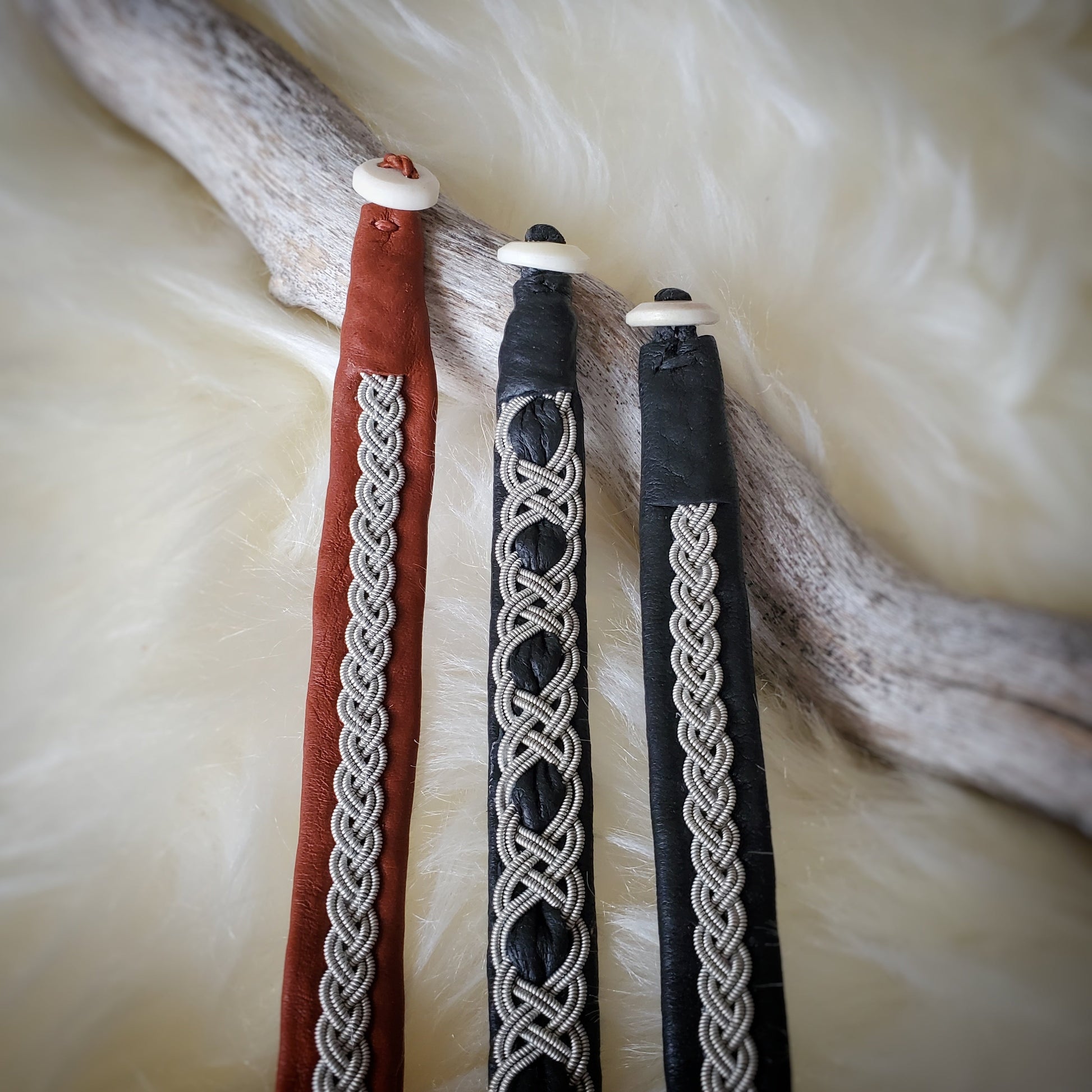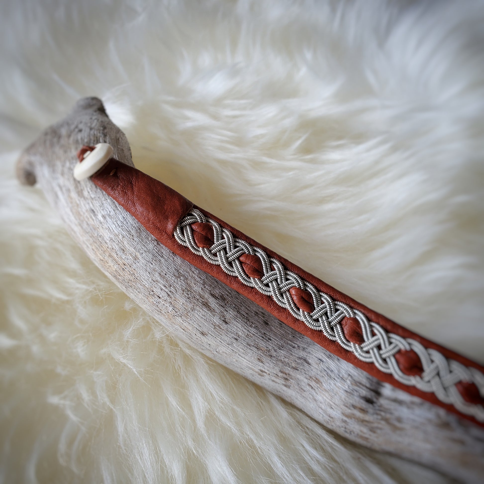 Introducing the beloved Sami bracelet, a reindeer leather band bedazzled with metallic (+silver) weaves and secured by a reindeer antler (shed) button.